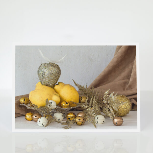 Christmas Gold and White combines traditional Christmas decorations with golden quinces to create a modern interpretation of the traditional still life. The quince is often associated with love, fertility and unity and here the three fruits are supporting a golden apple, redolent of the fruit in the Garden of Eden (often thought to be a quince). Above it all is a curled white feather, symbolic of the Holy Spirit.